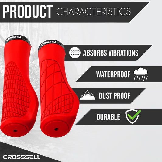 CROSSSELL Ergonomic Bike Grips - Handlebar Grips for Mountain Bikes, Non-Slip Lock-On Grips [RED]